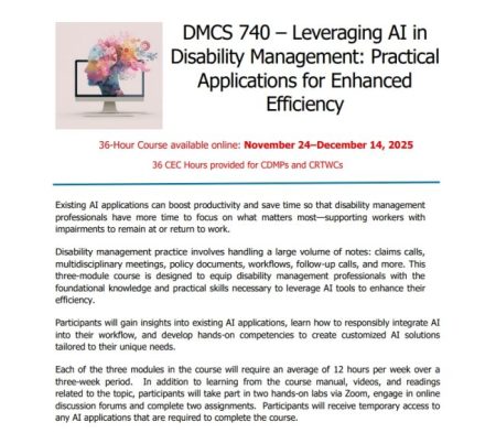 Disability management practice involves handling a large volume of notes, documents, calls, meetings, workflows, follow-up, and more. This new course is designed to equip DM professionals with foundational knowledge and practical skills necessary to leverage AI tools to enhance efficiency. This new 36-hour, 3-module course will be available online: November 24 – December 14, 2025. For more details, please review the Course Description and Learning Objectives set out in the newsletter – link provided below.