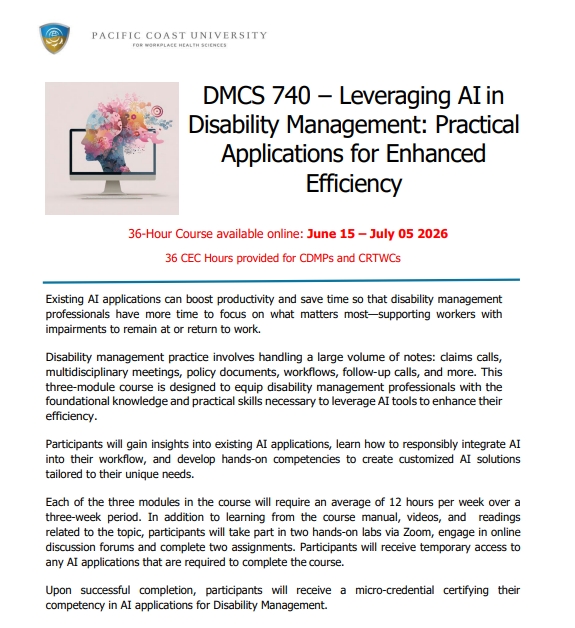 Disability management practice involves handling a large volume of notes, documents, calls, meetings, workflows, follow-up, and more. This new course is designed to equip DM professionals with foundational knowledge and practical skills necessary to leverage AI tools to enhance efficiency. This new 36-hour, 3-module course will be available online: June 15- July 5, 2026. For more details, please review the Course Description and Learning Objectives set out in the newsletter – link provided below.